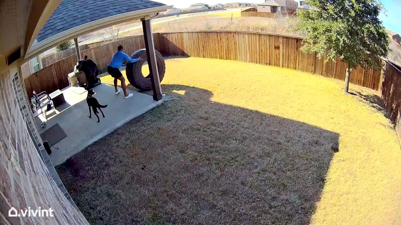 A man rolls a large tire into the backyard. He slips and falls but the wheel rolls on. He gets up quickly to stop it before it hits the fence, but it hits the fence and he falls over again. The tire falls next to him and he yells, "Man down!" Security footage.