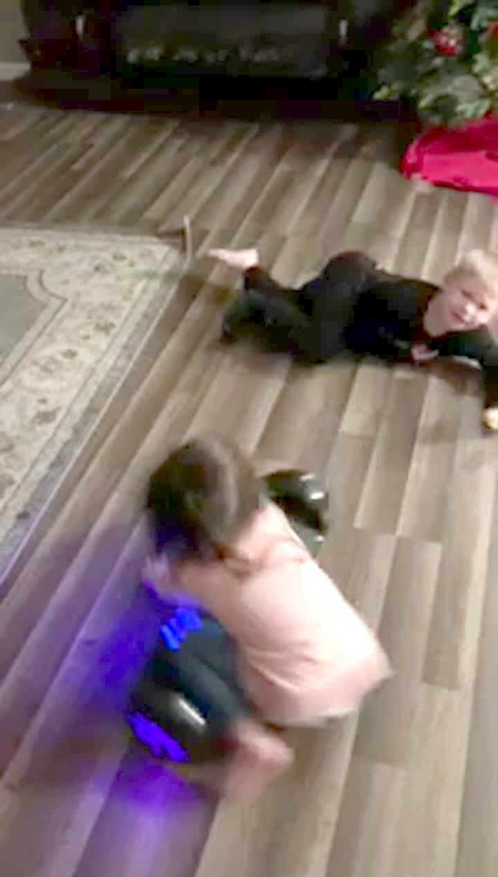 A young girl sits on a hoverboard and spins in circles and then bumps into her older brother and knocks him down.