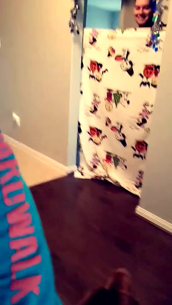 A doberman pinscher dog runs to a man when he slips and falls in to a bedroom as he runs away while he does the what the fluff challenge.