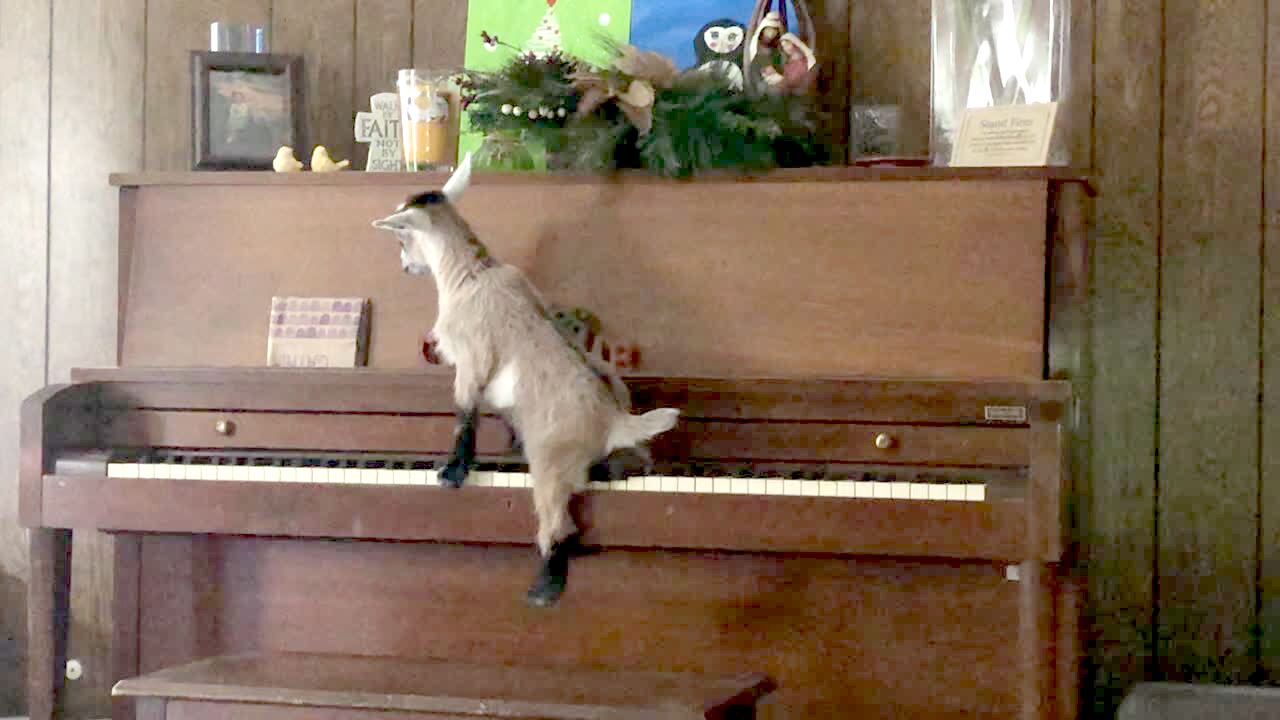 A baby goat hits their hooves on a piano in the living room before they climb on to the keys and walk across them.