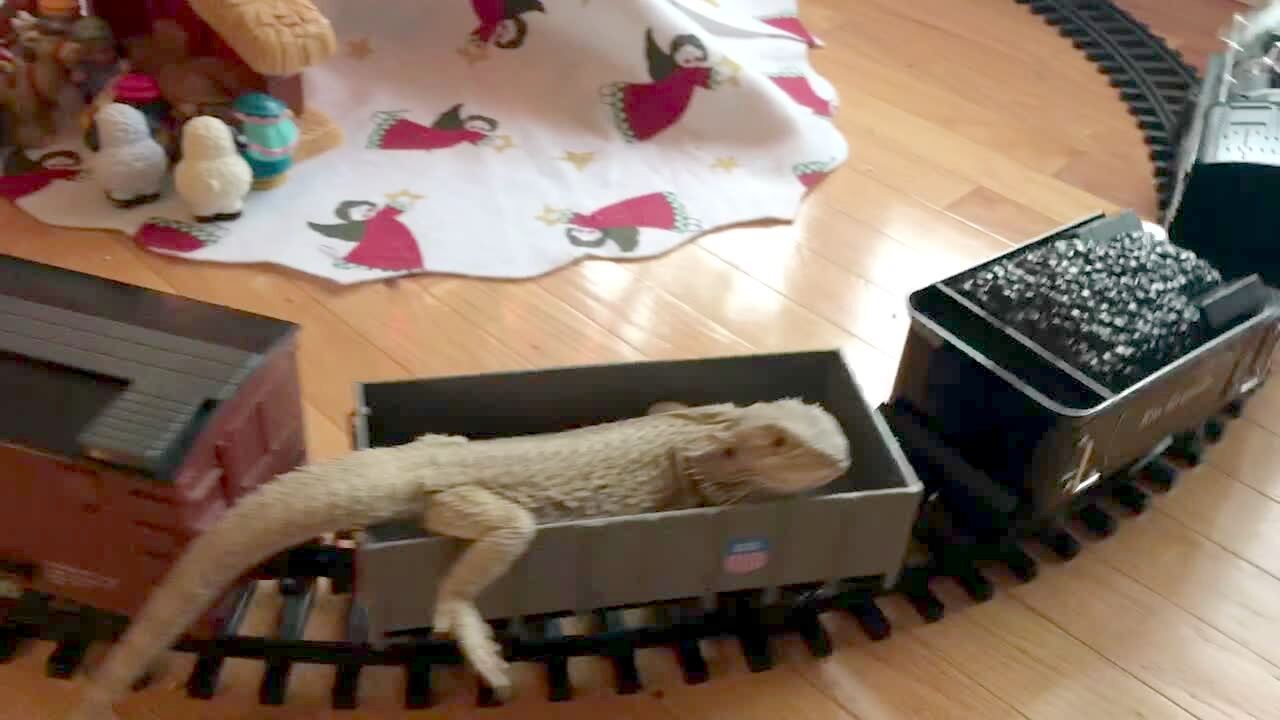 A lizard lays on a toy train and rides it in circles on a track under a Christmas tree in the living room.