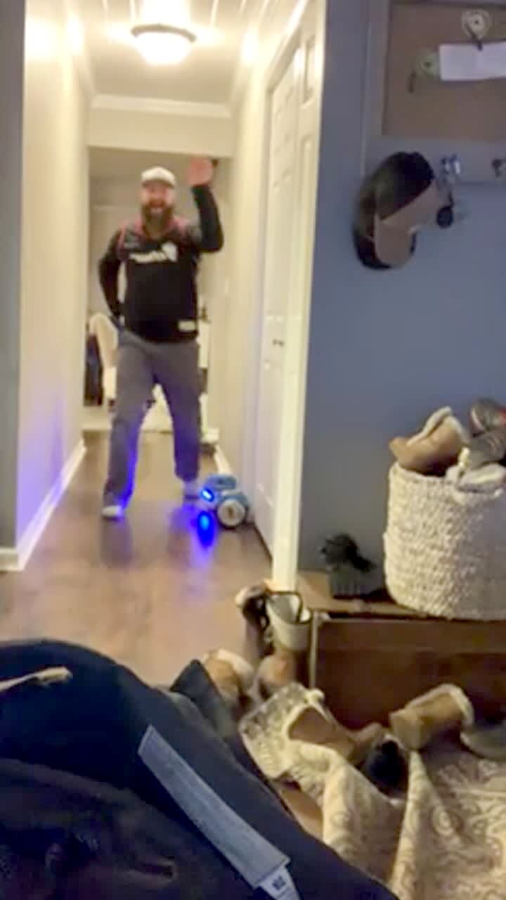 A man sings "Tiny Dancer" while he rides a hoverboard in the living room. He goes down the hallway and loses balance and falls.