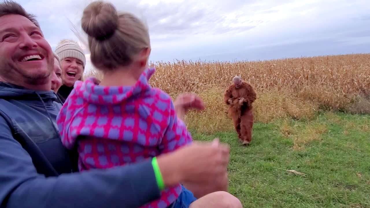 Kids scream on a hayride in a field when they see a man in a Sasquatch costume. He takes off the costume's head and a little girl stops screaming.