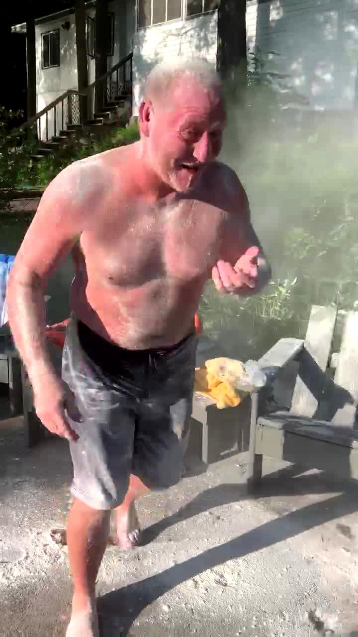 A man holds up a plate of flour in front of his brother then another man blows the flour with a leaf blower all over the brother's face then the brother jumps into the lake to clean off.