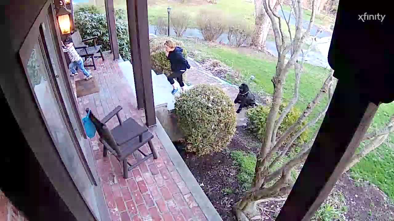 A woman tries to pull her black Labrador dog up the front stairs but the dog refuses to move and pulls her back into the bush next to the steps.