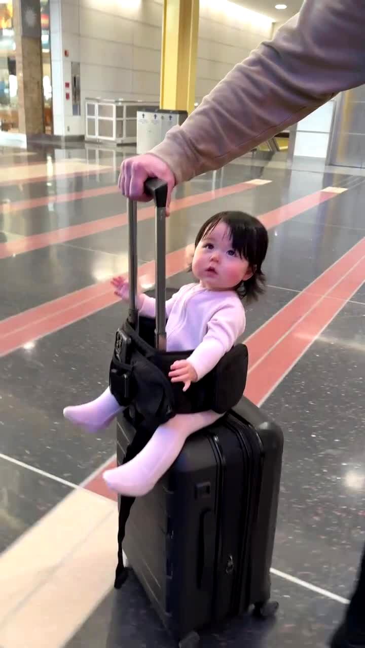 A baby girl rides on top of a suitcase that dad rolls in airport. The man rolls over a bump on the floor and it causes baby girl to hit her face on the handle. Featured talent cleared (little girl and her father pushing her).