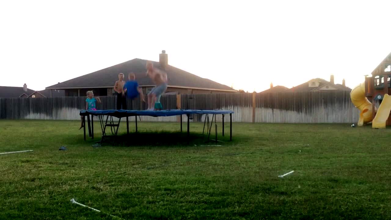 A man jumps on a trampoline with his kids in the yard and he bounces his son very high and the boy falls off the trampoline.