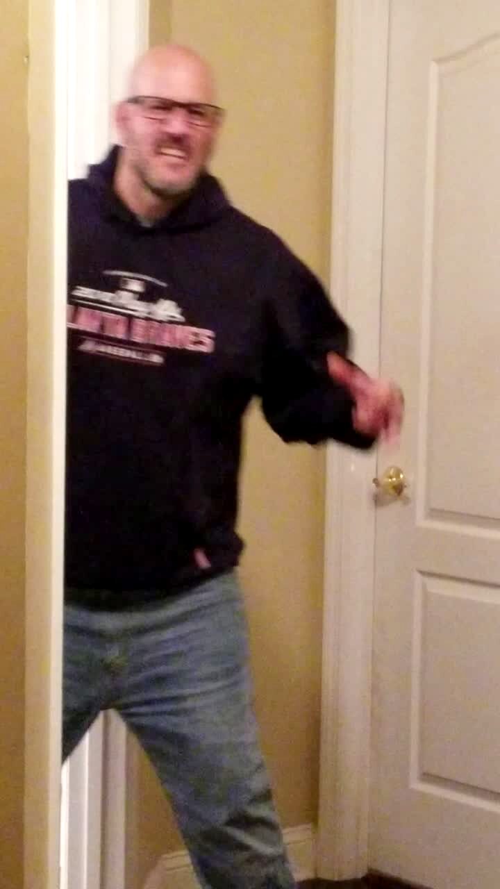A grandmother and her teen grandson decorate a front porch for Spring, when they both scream and run back inside of a home when a bird or bat flies at them. Security footage.