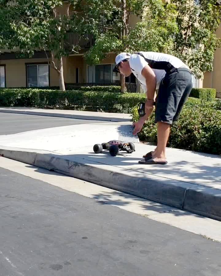 A man sets a remote control car down on the sidewalk and it starts to drive fast right away and crashes into a young boy on a bike and the boy falls off the bike.