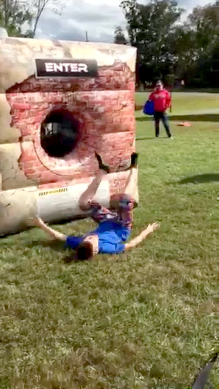A boy runs and tries to jump into a bouncy castle outdoors but does not fit into the opening and falls backwards. Featured talent cleared (the boy who misses the hole).