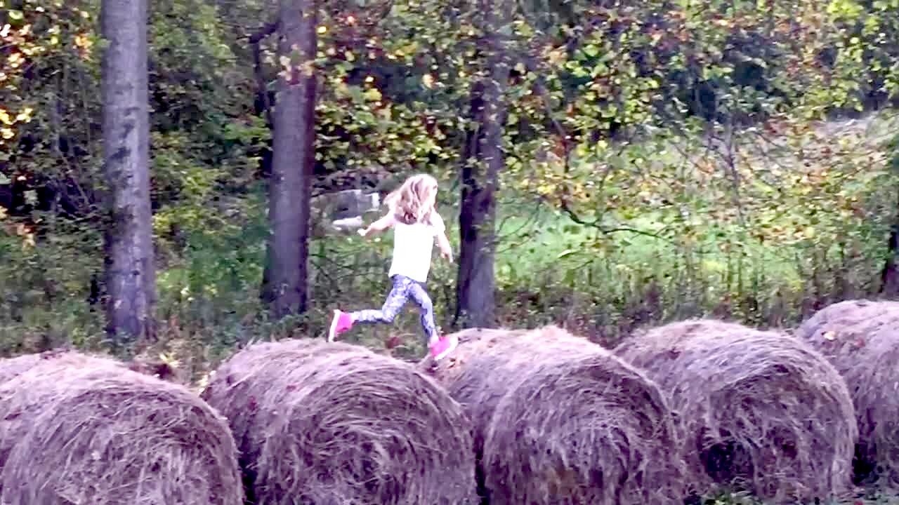 A tot girl wears a granny costume and says her back hurts.The woman with the camera asks how old she is and the girl says "thirty three."