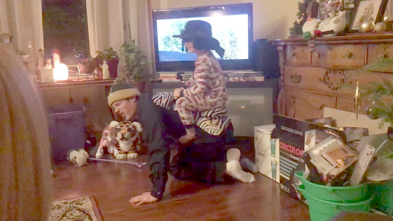 A young girl and her younger sister hold baby dolls in a their arms while staring at an off camera television. Their mother tells them that they will be "such good mommies," then the young girl makes eye contact and defiantly drops her doll on the floor.