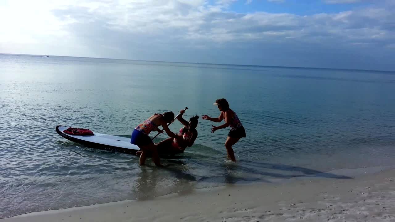 A man pushes a teen boy in a kayak off of a dock and into water and the kayak tips over and he falls into the water. The boy swims to the dock and says that his phone was in his pocket.