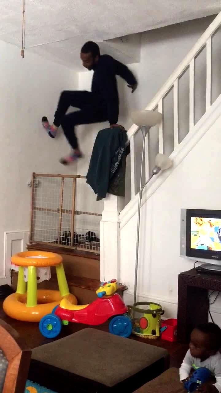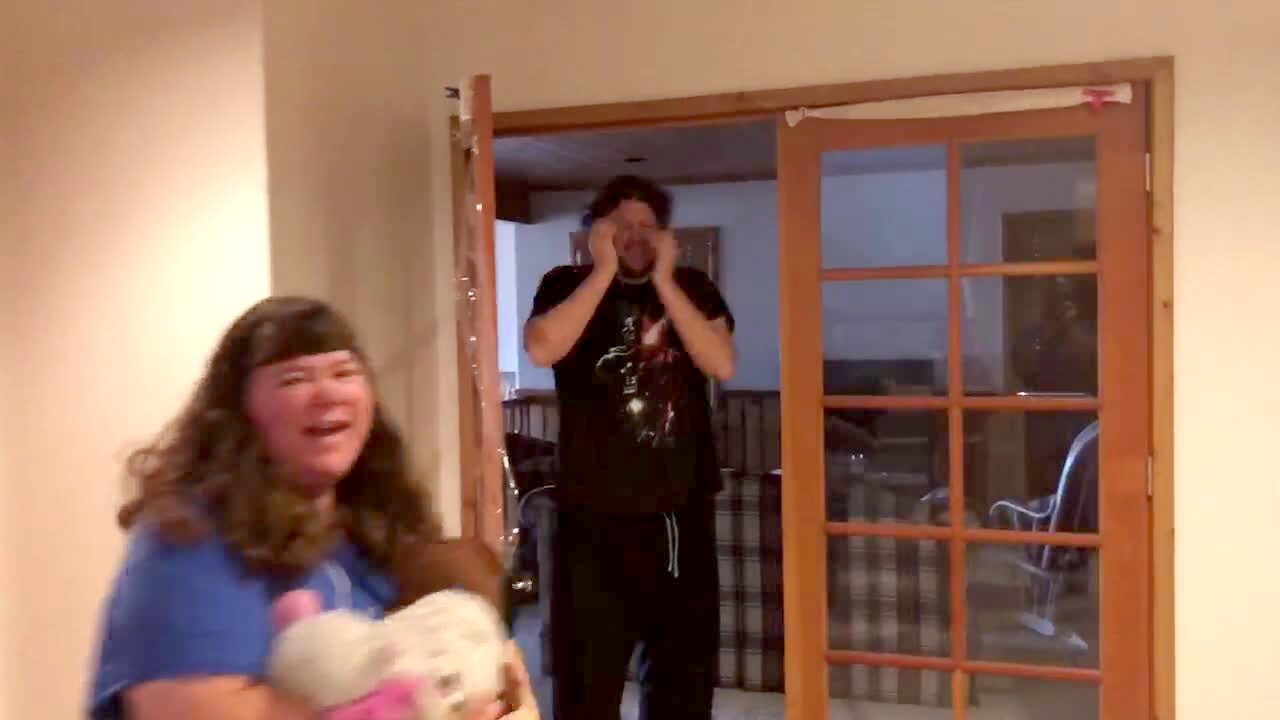 A young man walks through a doorway and his face hits a thin wall of saran wrap.