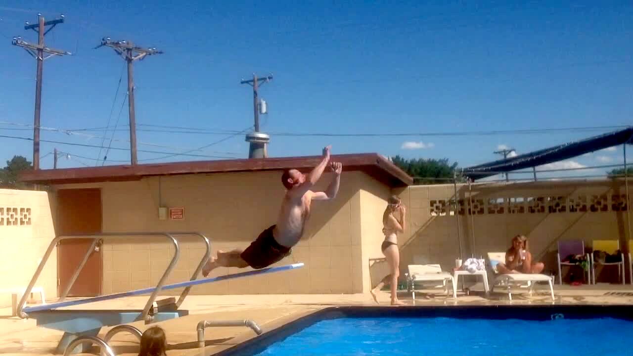 A man jumps on a diving board at a pool, but slips and falls head-first into the water. Featured talent cleared (the man on the diving board).