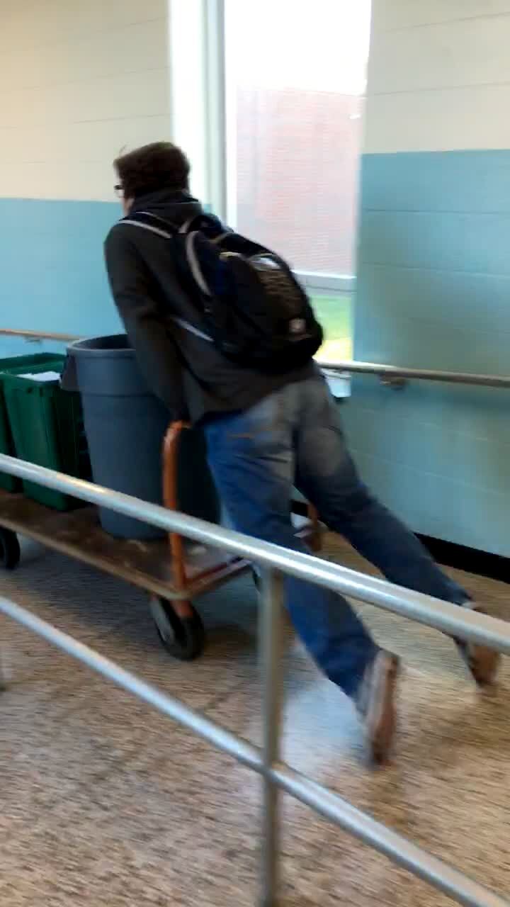 A teen boy rides a hand dolly down a ramp. The dolly crashes into a rail and the garbage cans on the dolly are thrown off.