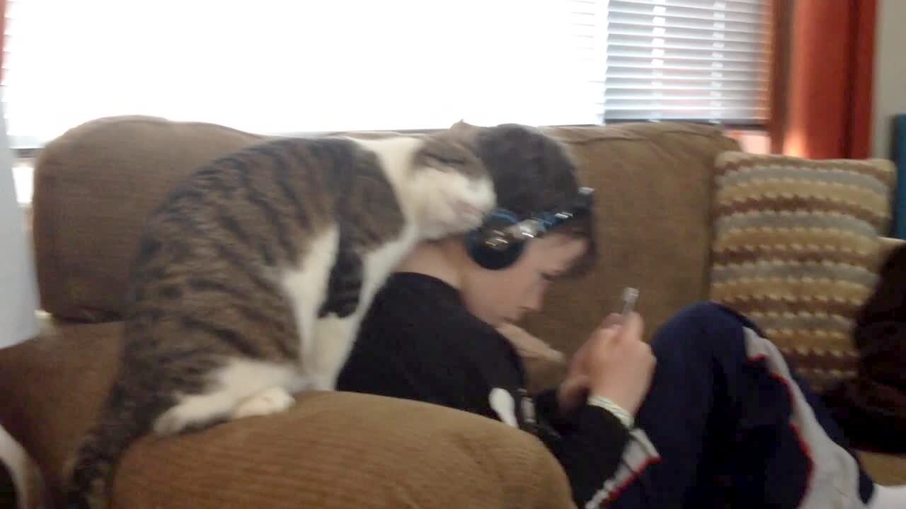 A striped cat rubs its head against a boy listening to music through headphones on a couch, not giving up as the boy tries to move away.