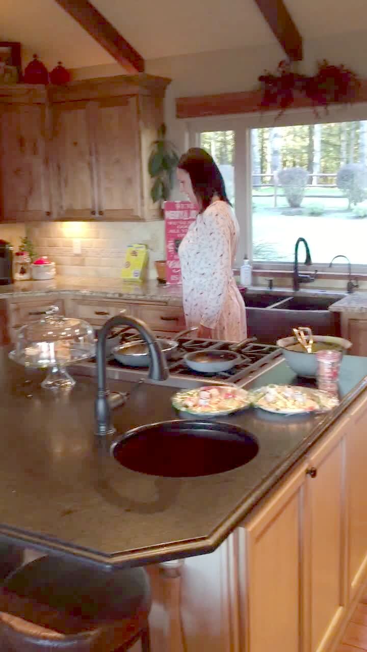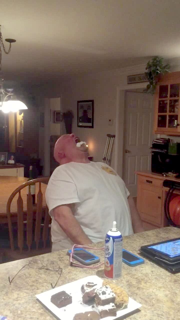 A family tries to do a trick where they flip whipped cream from their hands to their mouths. A woman tries to do this and the cream lands on the ceiling.