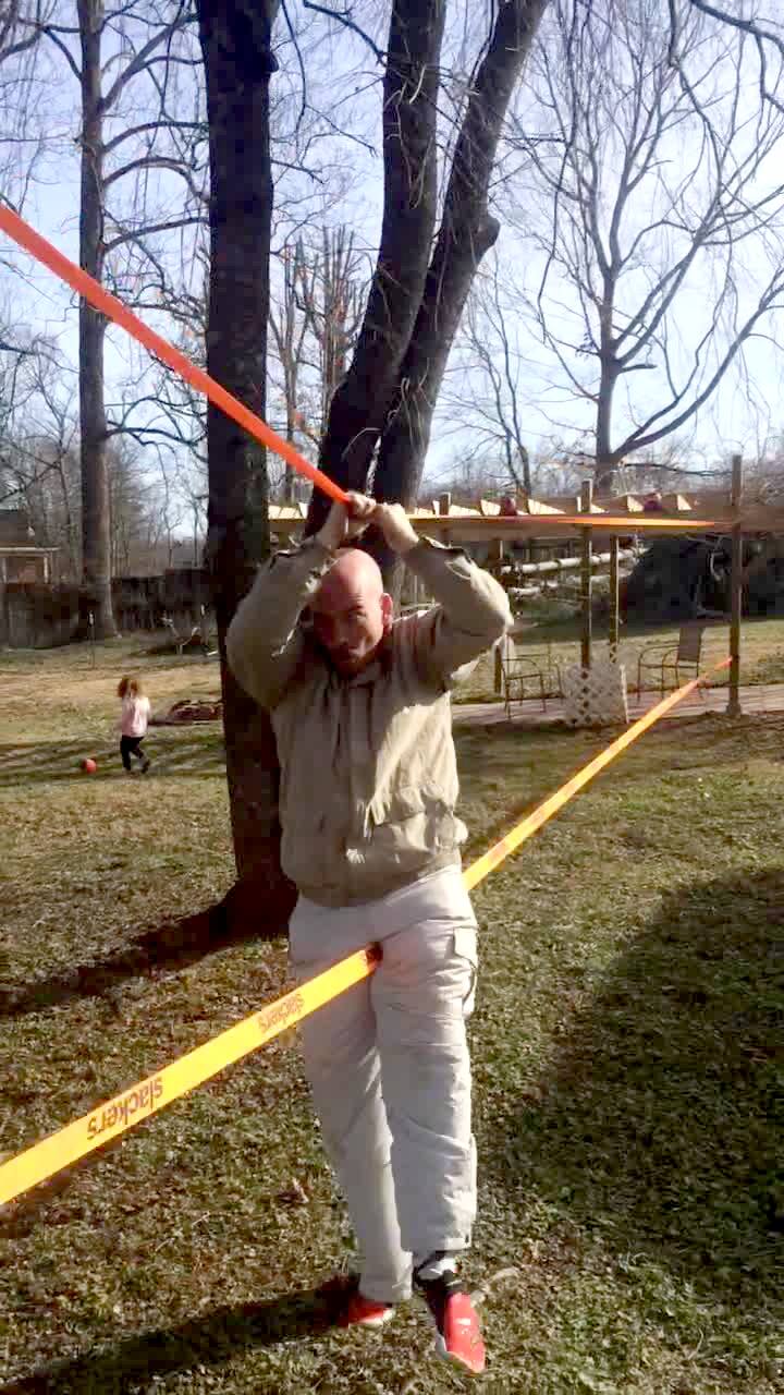 A man walks on a tight rope, he falls off and is hit in the groin.