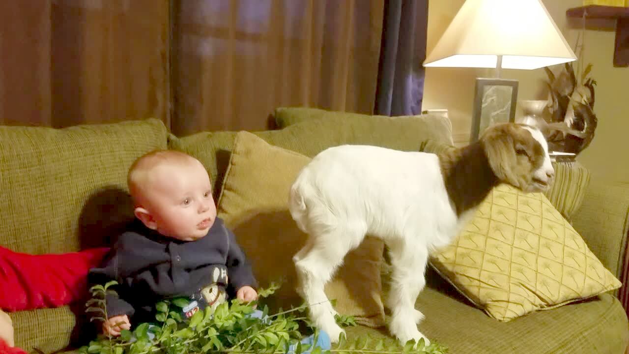 A baby boy cries when a baby goat screams.