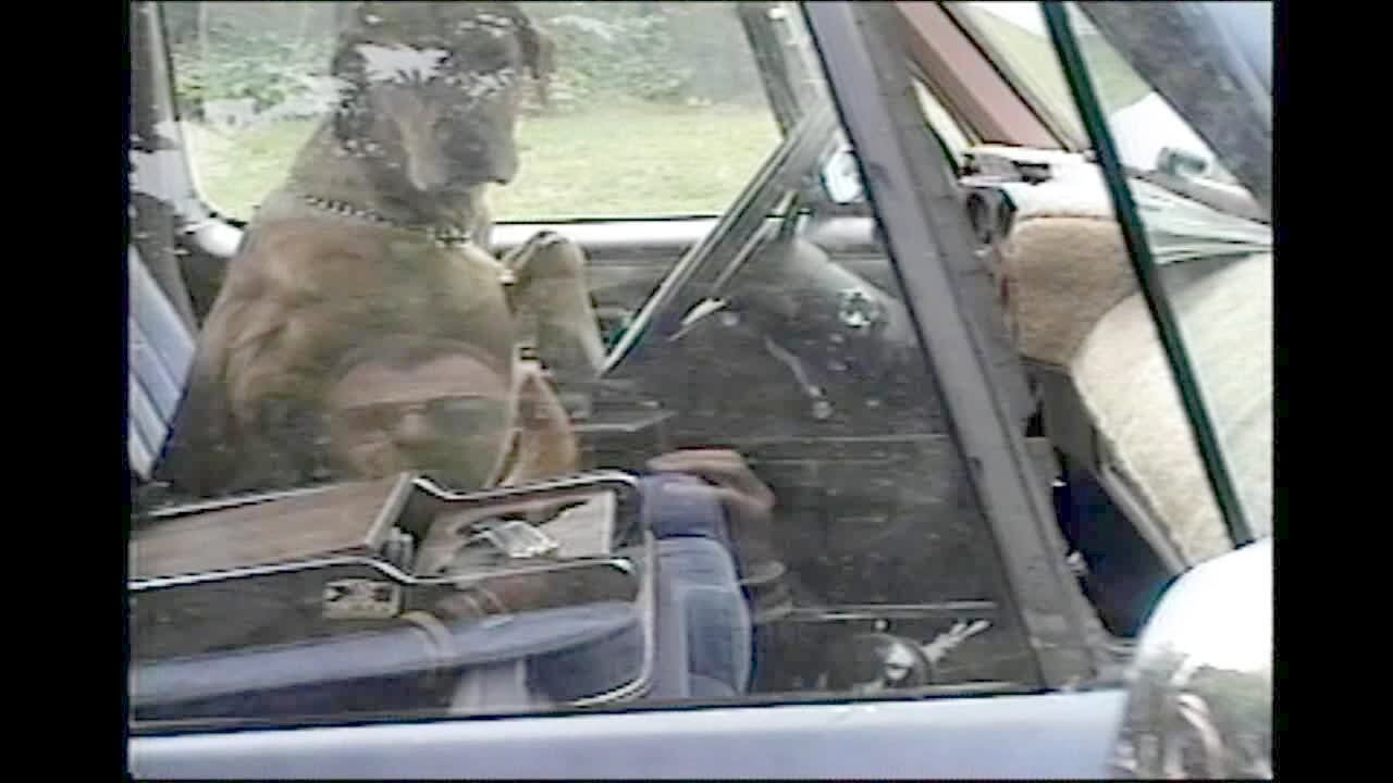 Dog riding in car with head out window, has cheeks flap in the wind.