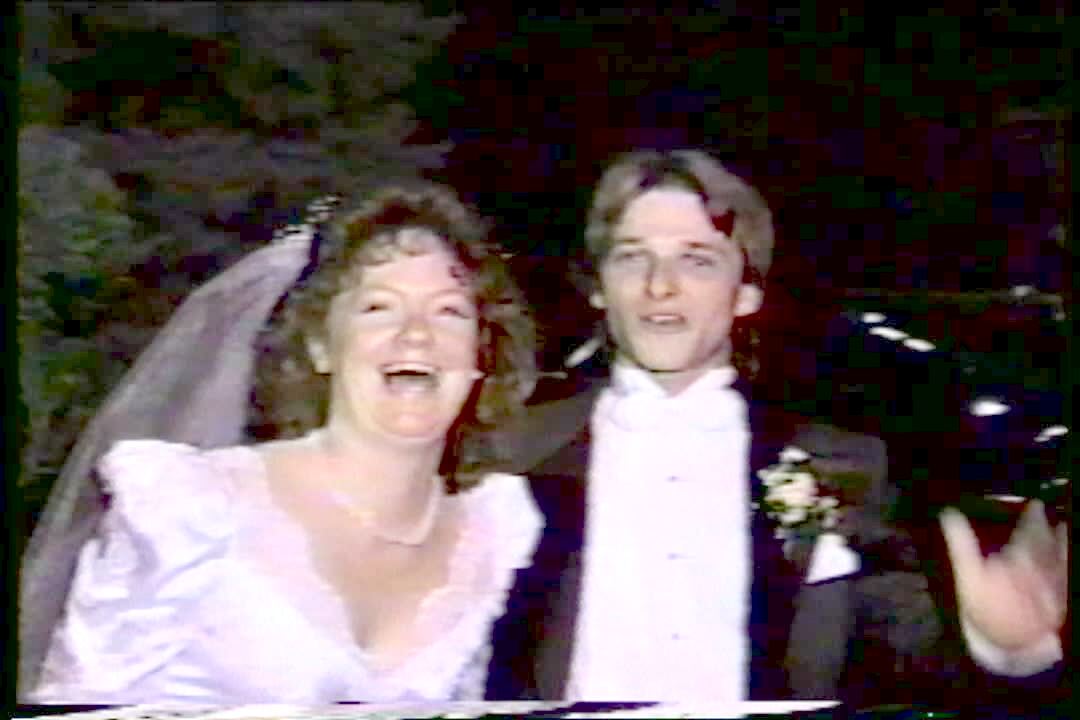 Groom tries to pop cork off champagne bottle. It pops Brides hat off