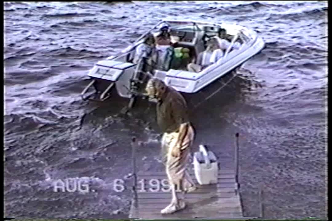 Young boy fishes in a boat. He thinks he is reeling in a fish, but his dad comes out of the water instead.