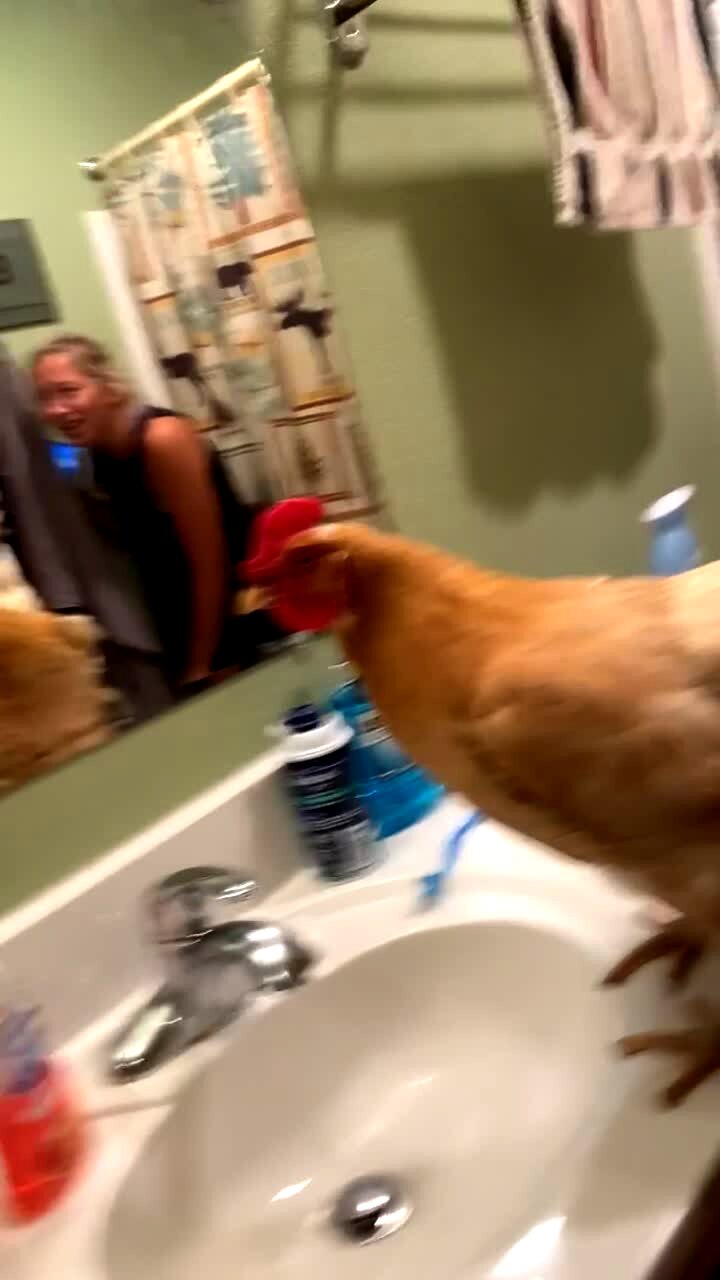 A young boy holds a chicken and opens a bathroom door while a woman is on the toilet. The woman screams and the boy sets the chicken on the bathroom sink.