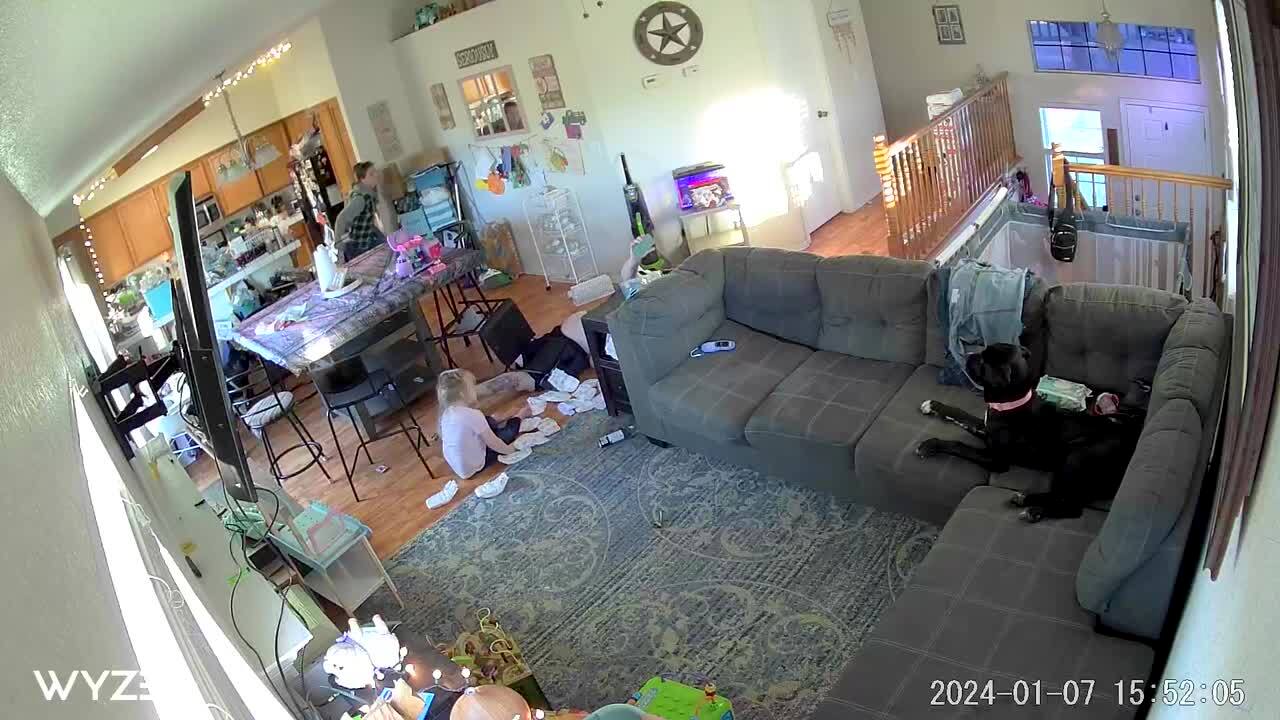 A man in the living room runs to catch a baby boy before he falls down the stairs but the dad slips and his shorts fall off. A woman picks up the son. Security footage.