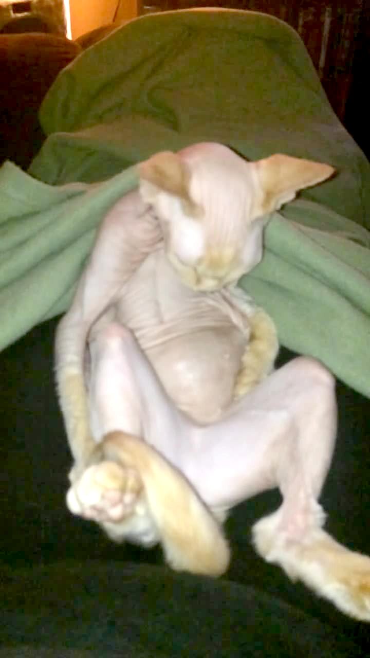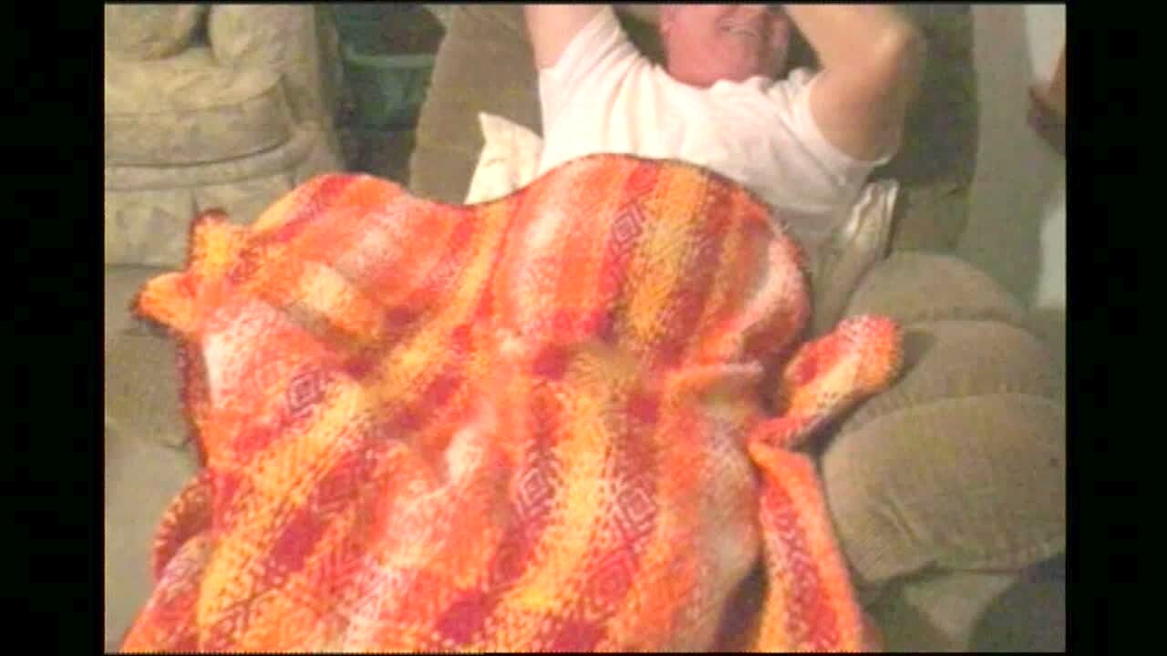 A woman tries to snuggle with her dog on a living room couch, when it paws and pushes her off and she falls to the floor. Security footage.