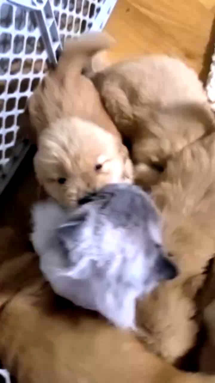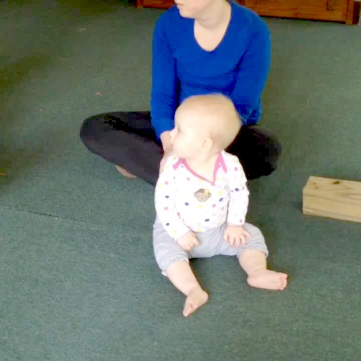 A young girl pats a baby boy on the head. She says, "He's really cute. You wanna pet him?"
