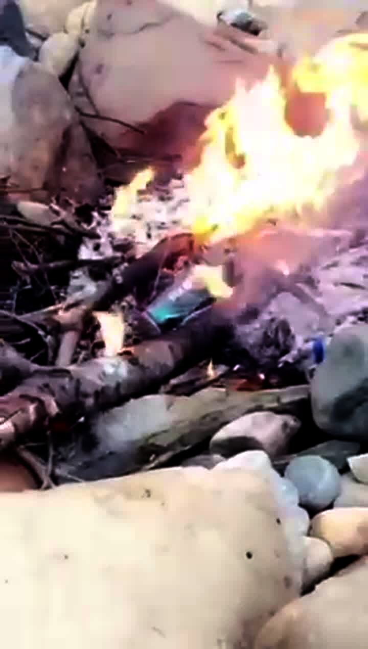 A teen boy tries to run and jump onto a broken bridge over a stream, but he slips and falls in the water.
