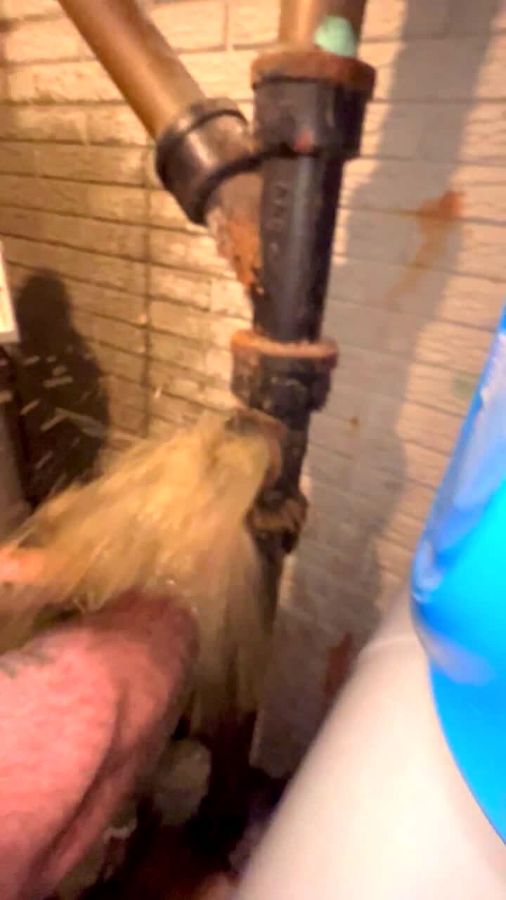 A man struggles to remove a cap on a broken pipe in the basement while another man makes fun of him. He pulls the cap free, then dirty water hits him.