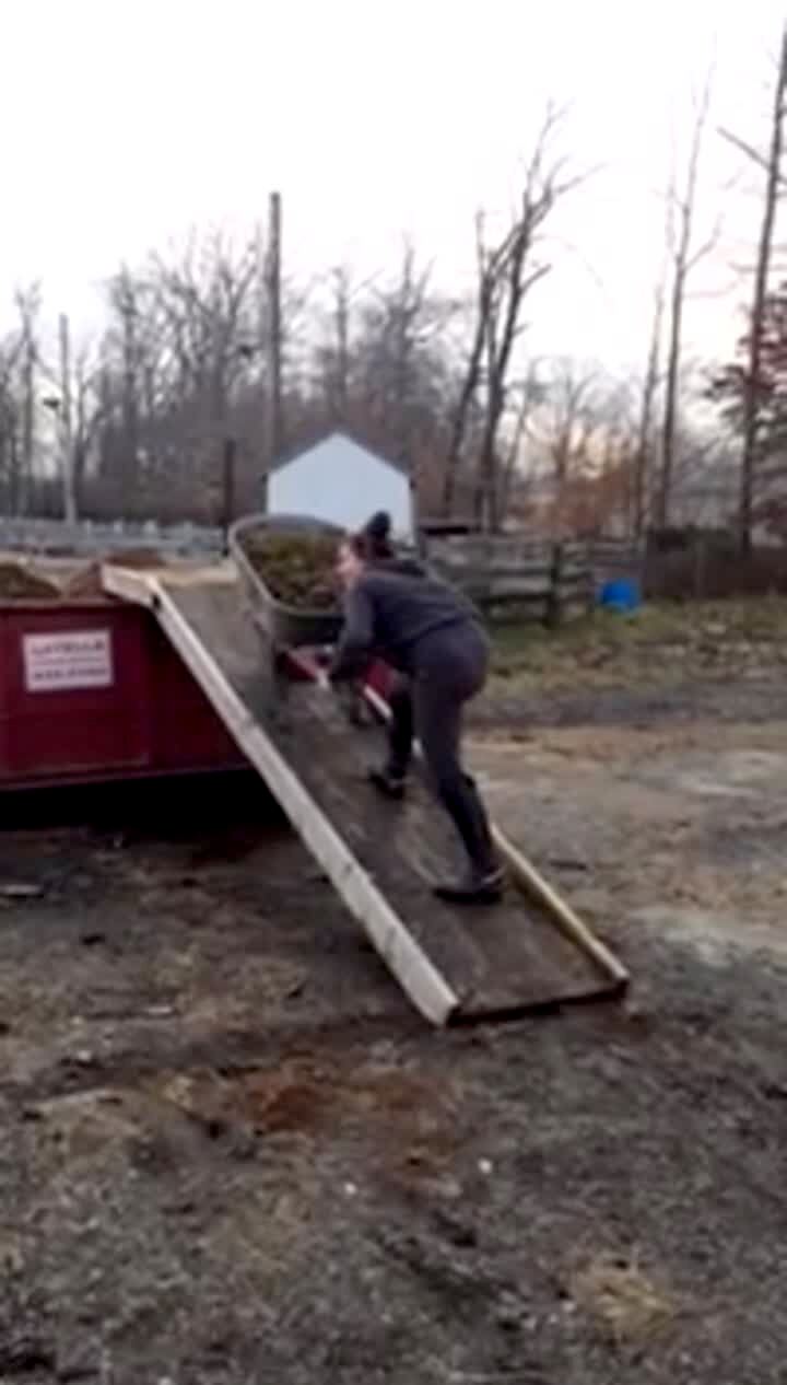 A teen girl pushes a wheelbarrow full of horse poop up a ramp to dump into a large dumpster, but slips and falls and all the poop spills onto her.