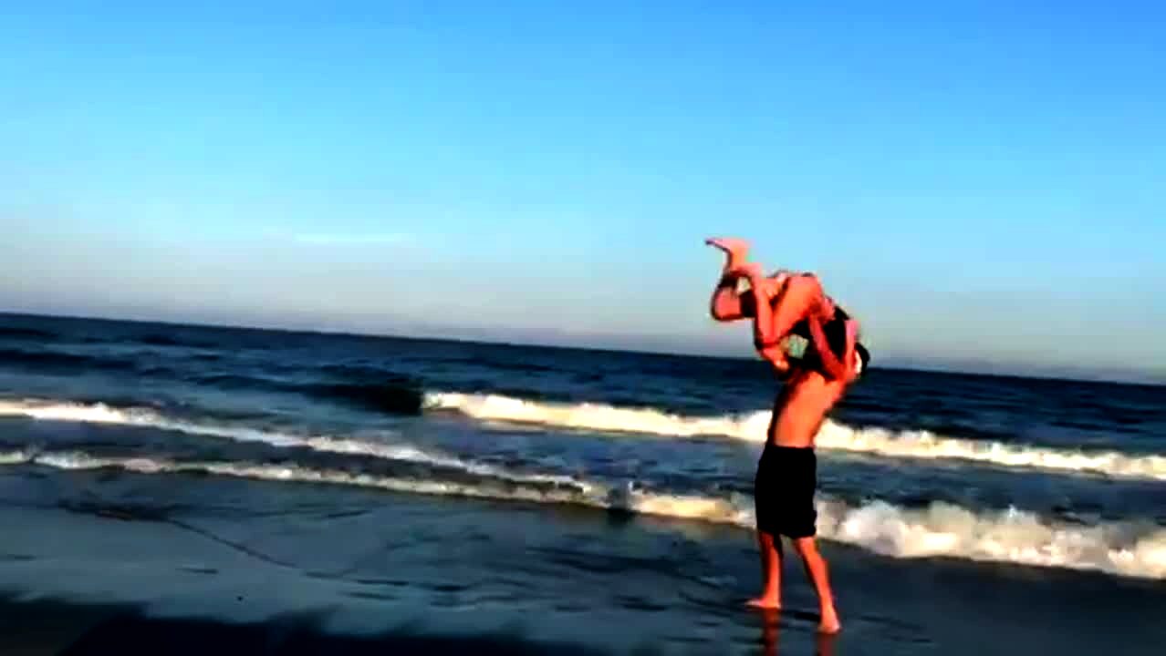 A senior man runs across his patio with just a towel on. He tries to avoid his excited dog but the dog pulls his towel off as the man runs into the house.