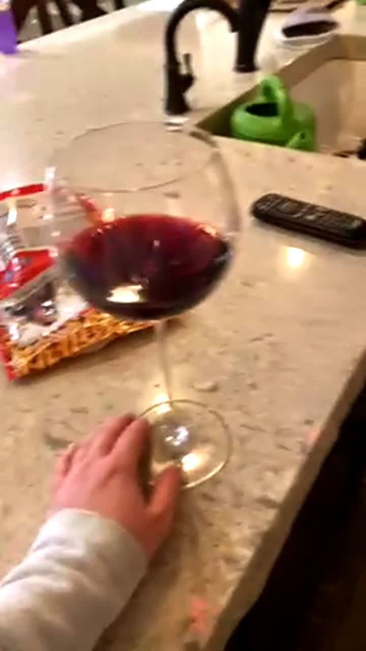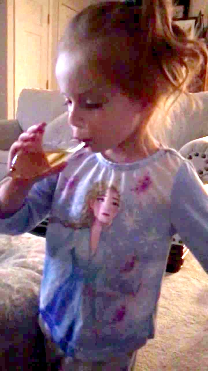 A tot girl drinks apple juice out of a champagne glass in the living room, and says it's tough "being a mom" and "that's what we do."