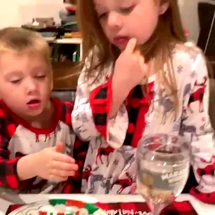 A tot boy show his mom the cookies and milk for Santa Claus. Her young daughter then shows the glass of wine they have out for Mrs. Claus. She says that Mrs. Claus needs wine because she is tired of the elves and it's exhausting.